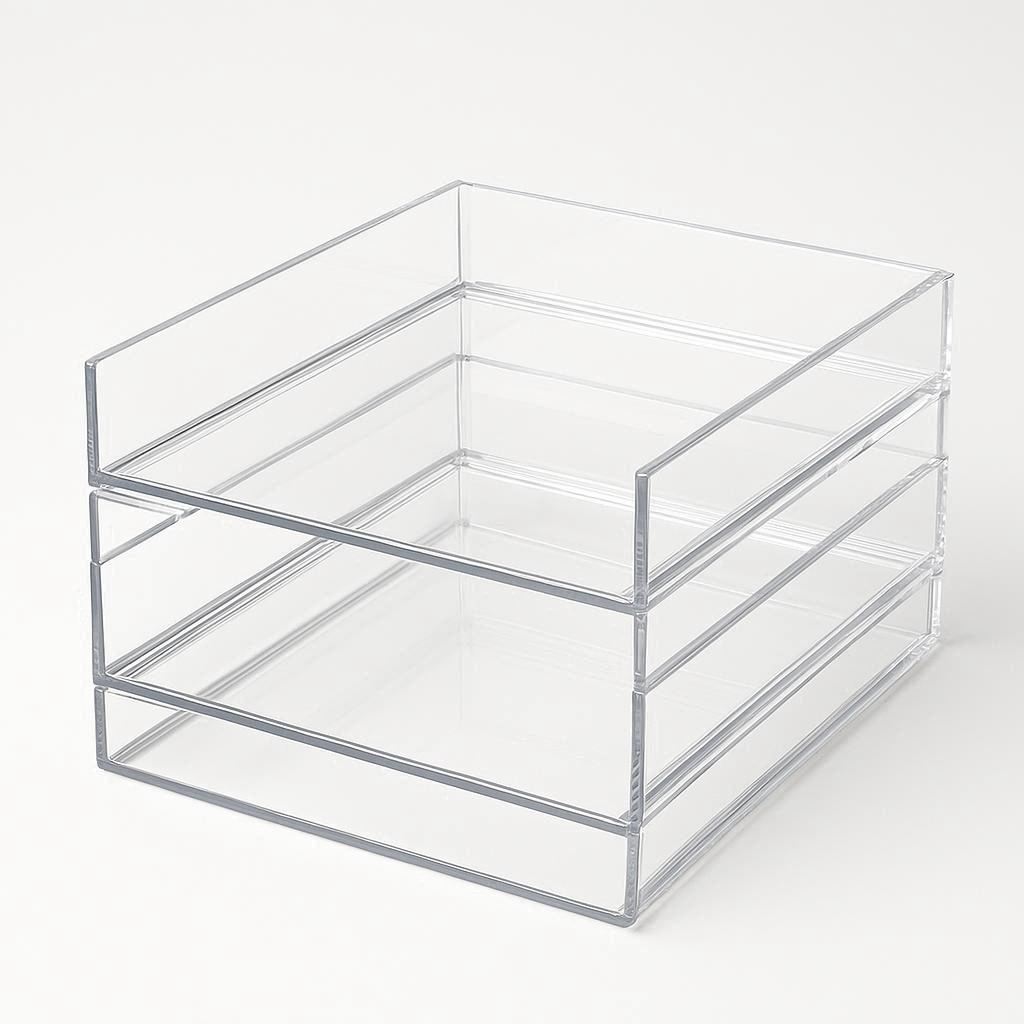Transparent acrylic tray with a polished edge, allowing you to stack multiple trays for modular storage and visibility.