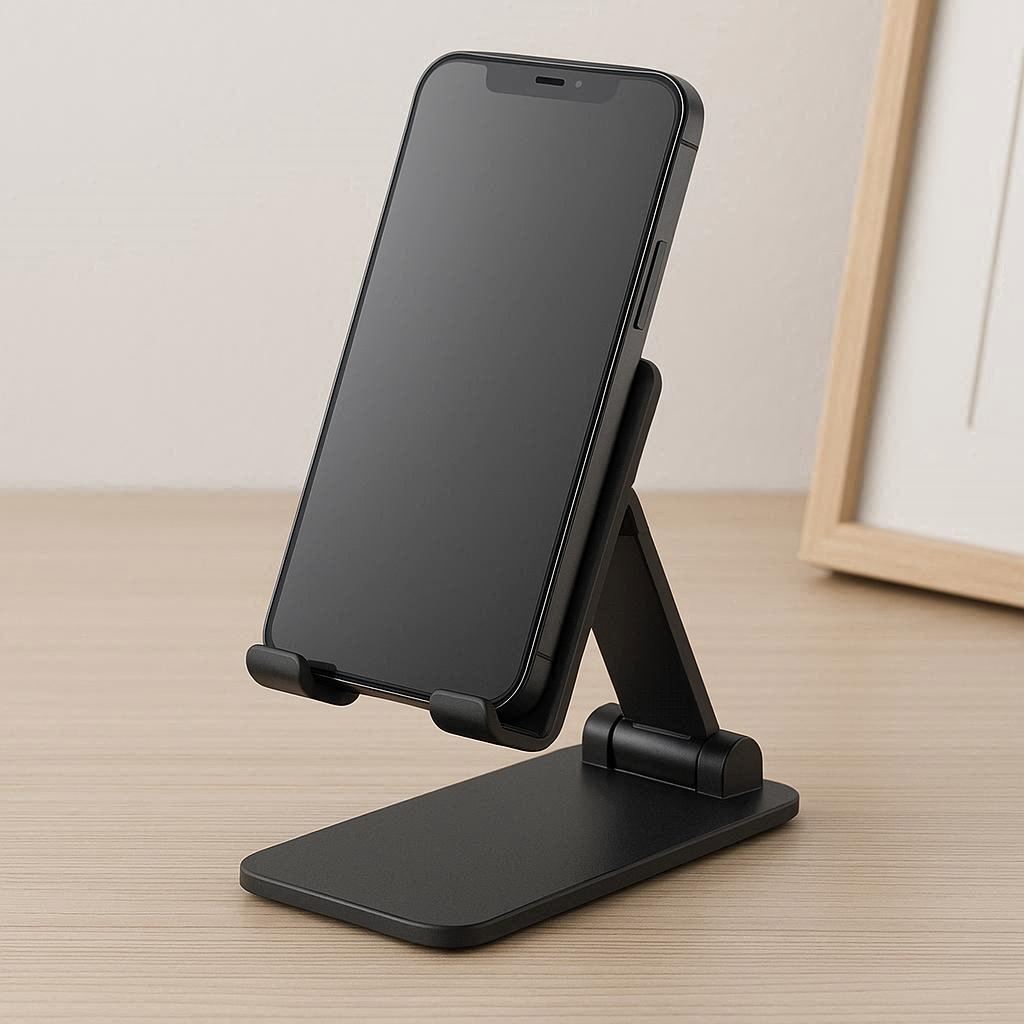 Compact foldable stand that collapses flat for easy storage, ideal for desks, nightstands, or travel.
